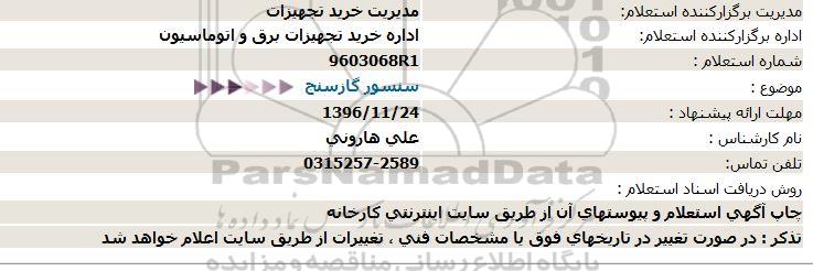 استعلام بها و موضوع استعلام استعلام , استعلام سنسور گازسنج به اطلاع کلیه شرکتها و افراد متخصص واجد شرایط میرساند، آگهی گذار در نظر دارد از طریق استعلام بها، نسبت به انتخاب و دریافت پیشنهادات اقدام نماید. این استعلام با کد آگهی ثبت شده در سامانه خبرگزاری پارس نماد : 1048566 منتشر شده است. مشخصات استعلام : تاریخ شروع استعلام: 1396/11/17 آخرین مهلت ارسال پیشنهاد قیمت : 1396/11/24 و محل اجرای پروژه : استان اصفهان میباشد. استعلام قیمت مورد درخواست : استعلام , استعلام سنسور گازسنج با دستهبندیهای تخصصی و گروه های مرتبط : ابزار دقیق, سیستم ایمنی ، اتش نشانی،اعلام و اطفای حریق, استعلام اطلاع رسانی میگردد.