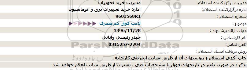 استعلام بها و موضوع استعلام استعلام , استعلام لامپ فوق کم مصرف به اطلاع کلیه شرکتها و افراد متخصص واجد شرایط میرساند، آگهی گذار در نظر دارد از طریق استعلام بها، نسبت به انتخاب و دریافت پیشنهادات اقدام نماید. این استعلام با کد آگهی ثبت شده در سامانه خبرگزاری پارس نماد : 1049882 منتشر شده است. مشخصات استعلام : تاریخ شروع استعلام: 1396/11/19 آخرین مهلت ارسال پیشنهاد قیمت : 1396/11/28 و محل اجرای پروژه : استان اصفهان میباشد. استعلام قیمت مورد درخواست : استعلام , استعلام لامپ فوق کم مصرف با دستهبندیهای تخصصی و گروه های مرتبط : صنایع روشنایی, تجهیزات برق و الکترونیک, استعلام اطلاع رسانی میگردد.