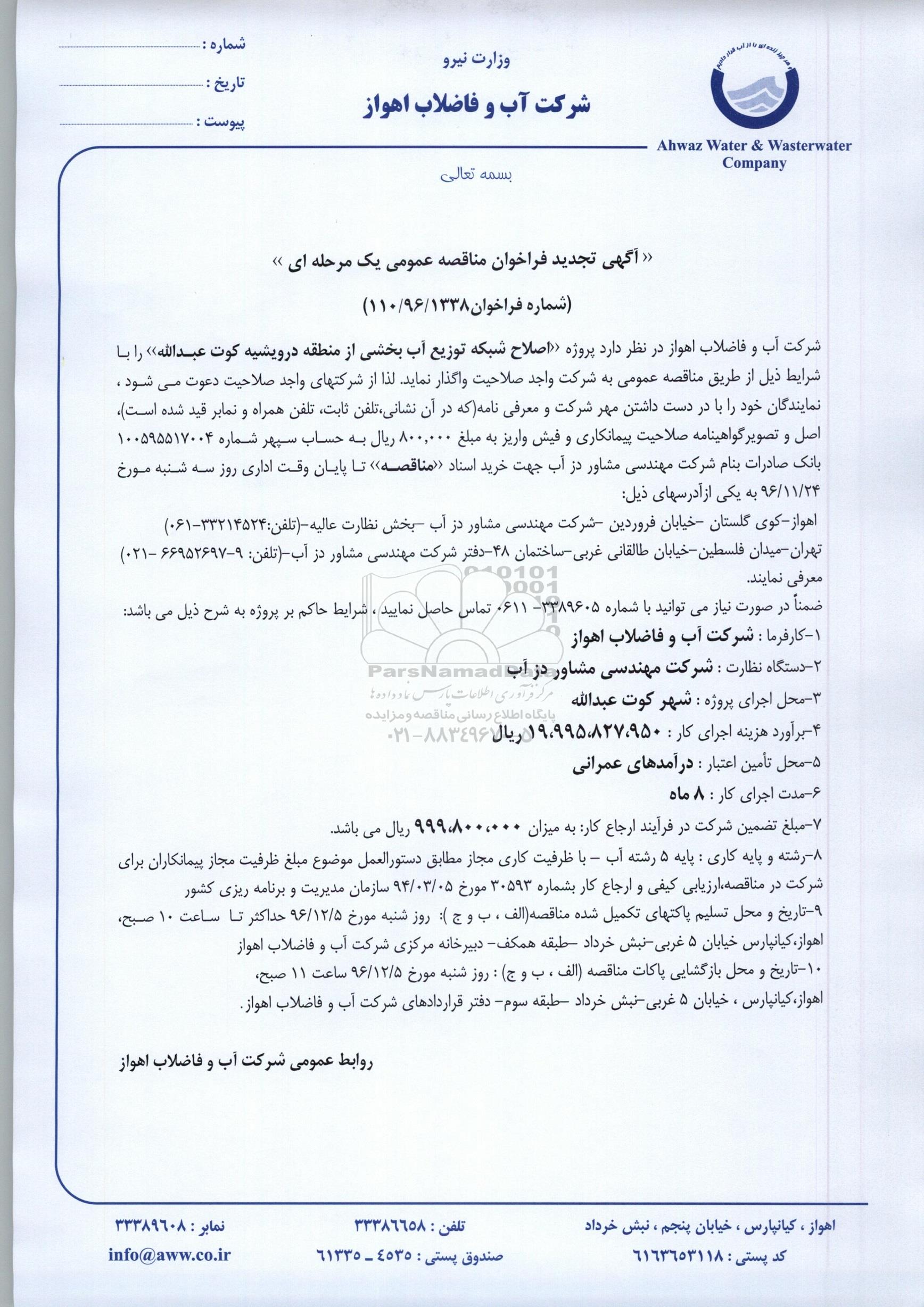 شرکت آب و فاضلاب اهواز در نظر دارد پروژه اصلاح شبکه توزیع آب بخشی از منطقه درویشیه کوت عبدالله را با شرایط ذیل از طریق مناقصه عمومی به شرکت واجد صلاحیت واگذار نماید. لذا از شرکت های واجد صلاحیت دعوت می شود نمایندگان خود را با در دست داشتن مهر شرکت و معرفی نامه (که در آن نشانی، تلفن ثابت، تلفن همراه و نمابر قید شده است)، اصل و تصویر گواهینامه صلاحیت پیمانکاری و فیش واریز به مبلغ 800.000 ریال به حساب سپهر شماره 100595517004 بانک صادرات به نام شرکت مهندسی مشاور دز آب جهت خرید اسناد مناقصه تا پایان وقت اداری روز سه شنبه مورخ 96.11.24 به یکی از آدرس های ذیل: