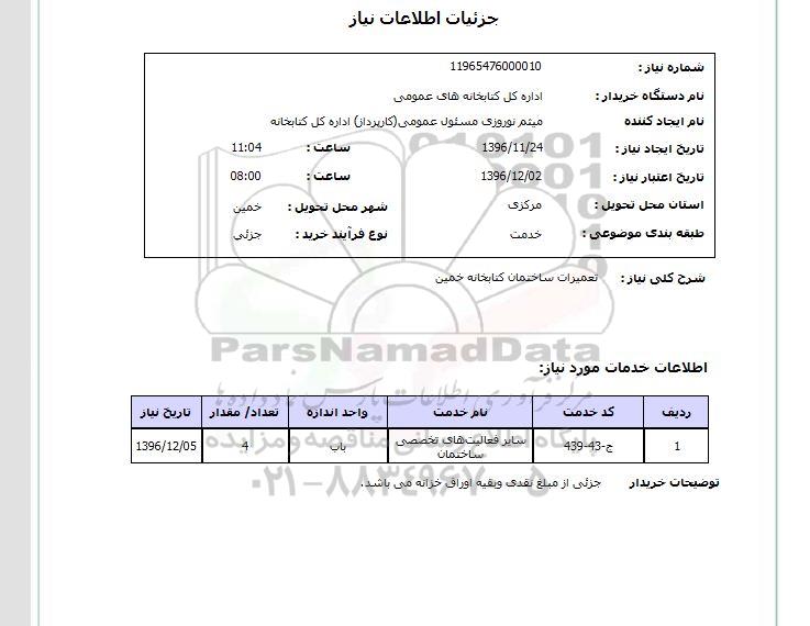شرح کلی نیاز: تعمیرات ساختمان کتابخانه خمین
