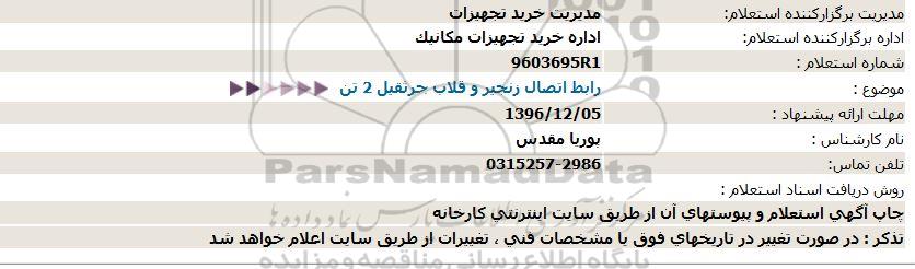 استعلام بها و موضوع استعلام استعلام رابط اتصال زنجیر و قلاب جرثقیل 2 تن به اطلاع کلیه شرکتها و افراد متخصص واجد شرایط میرساند، آگهی گذار در نظر دارد از طریق استعلام بها، نسبت به انتخاب و دریافت پیشنهادات اقدام نماید. این استعلام با کد آگهی ثبت شده در سامانه خبرگزاری پارس نماد : 1054892 منتشر شده است. مشخصات استعلام : تاریخ شروع استعلام: 1396/11/25 آخرین مهلت ارسال پیشنهاد قیمت : 1396/12/05 و محل اجرای پروژه : استان اصفهان میباشد. استعلام قیمت مورد درخواست : استعلام رابط اتصال زنجیر و قلاب جرثقیل 2 تن با دستهبندیهای تخصصی و گروه های مرتبط : جرثقیل, استعلام اطلاع رسانی میگردد.