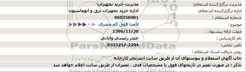 استعلام بها و موضوع استعلام استعلام ، استعلام استعلام لامپ کم مصرف به اطلاع کلیه شرکتها و افراد متخصص واجد شرایط میرساند، آگهی گذار در نظر دارد از طریق استعلام بها، نسبت به انتخاب و دریافت پیشنهادات اقدام نماید. این استعلام با کد آگهی ثبت شده در سامانه خبرگزاری پارس نماد : 1055919 منتشر شده است. مشخصات استعلام : تاریخ شروع استعلام: 1396/11/26 آخرین مهلت ارسال پیشنهاد قیمت : 1396/11/28 و محل اجرای پروژه : استان اصفهان میباشد. استعلام قیمت مورد درخواست : استعلام ، استعلام استعلام لامپ کم مصرف با دستهبندیهای تخصصی و گروه های مرتبط : صنایع روشنایی, تجهیزات برق و الکترونیک, استعلام اطلاع رسانی میگردد.