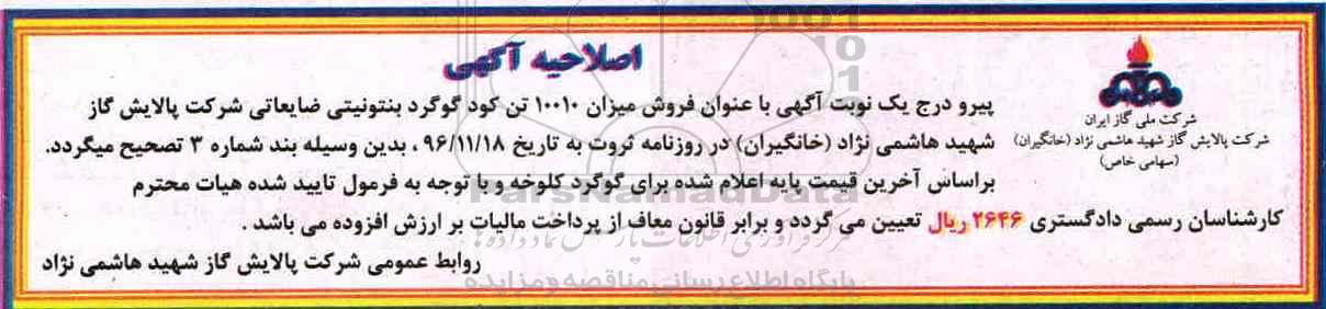 پیرو درج یک نوبت اگهی با عنوان فروش میزان 10010 تن کود گوگرد بنتونیتی ضایعاتی شرکت پالایش گاز شهید هاشمی نژاد ( خانگیران ) در روزنامه ثروت به تاریخ 96.11.18 بدین وسیله بند شماره 3 تصحیح می گردد