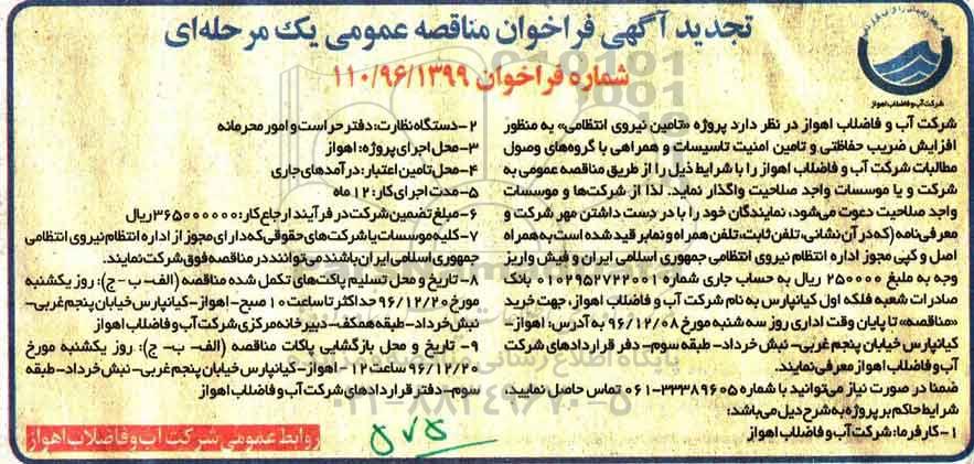 شركت آب و فاضلاب اهواز در نظر دارد پروژه تامین نیروی انتظامی به منظور افزایش ضریب حفاظتی و تامین امنیت تاسیسات و همراهی با گروههای وصول مطالبات شرکت آب و فاضلاب اهواز را با شرايط ذيل را از طريق مناقصه عمومی به شركت و یا موسسات واجد صلاحيت واگذار نمايد. لذا از شركتها و موسسات واجد صلاحيت دعوت مي شود ،نمایندگان خود را با در دست داشتن مهر شرکت و معرفی نامه(که در آن نشانی،تلفن ثابت، تلفن همراه و نمابر قید شده است به همراه اصل وکپی مجوز اداره انتظام نیروی انتظامی جمهوری اسلامی ایران و فيش واريز وجه به مبلغ۲۵۰،۰۰۰ ريال به حساب جاری شماره ۰۱۰۲۹۵۲۷۲۲۰۰۱ بانک صادرات شعبه فلکه اول کیانپارس بنام شرکت آب و فاضلاب اهواز ، جهت خريد اسناد ‹‹مناقصه ›› تا پایان وقت اداری روز 3شنبه مورخ 96.12.8 به آدرس: اهواز-کیانپارس خیابان ۵ غربی-نبش خرداد –طبقه سوم- دفتر قراردادهای شرکت آب و فاضلاب اهواز معرفی نمایند.