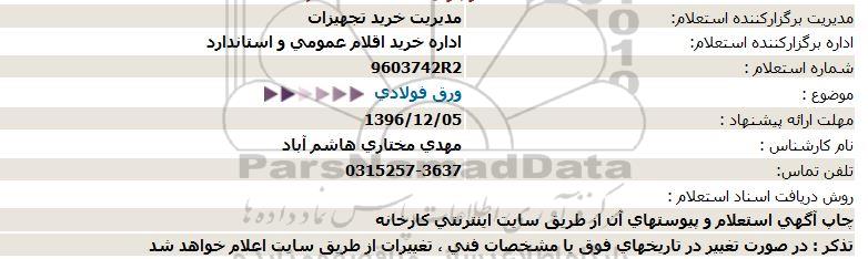 استعلام بها و موضوع استعلام استعلام, استعلام ورق فولادی به اطلاع کلیه شرکتها و افراد متخصص واجد شرایط میرساند، آگهی گذار در نظر دارد از طریق استعلام بها، نسبت به انتخاب و دریافت پیشنهادات اقدام نماید. این استعلام با کد آگهی ثبت شده در سامانه خبرگزاری پارس نماد : 1061330 منتشر شده است. مشخصات استعلام : تاریخ شروع استعلام: 1396/12/02 آخرین مهلت ارسال پیشنهاد قیمت : 1396/12/05 و محل اجرای پروژه : استان اصفهان میباشد. استعلام قیمت مورد درخواست : استعلام, استعلام ورق فولادی با دستهبندیهای تخصصی و گروه های مرتبط : آهن آلات, انواع ورق, استعلام اطلاع رسانی میگردد.