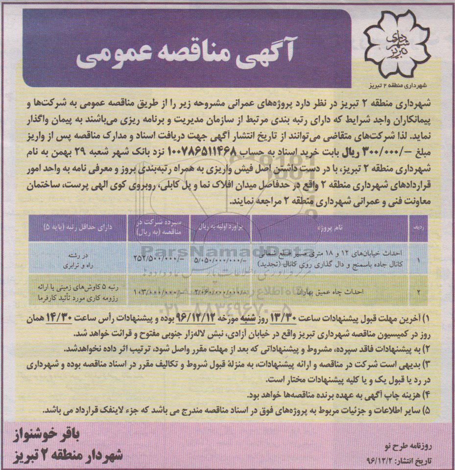 شهرداری منطقه 2 تبریز در نظر دارد پروژه های عمرانی مشروحه زیر را از طریق مناقصه عمومی به شرکت ها و پیمانکاران واجد شرایط که دارای رتبه بندی مرتبط از سازمان مدیریت و برنامه ریزی می باشند به پیمان واگذار نماید. لذا شرکت های متقاضی می توانند از تاریخ انتشار آگهی جهت دریافت اسناد و مدارک مناقصه پس از واریز مبلغ 300.000 ریال بابت خرید اسناد به حساب 100786511468 نزد بانک شهر شعبه 29 بهمن به نام شهرداری منطقه 2 تبریز، با در دست داشتن اصل فیش واریزی به همراه رتبه بندی بروز و معرفی نامه به واحد امور قراردادهای شهرداری منطقه 2 تبریز واقع در حدفاصل میدان افلاک نما و پل کابلی، روبروی کوی الهی پرست، ساختمان معاونت فنی و عمرانی شهرداری منطقه 2 مراجعه نمایند