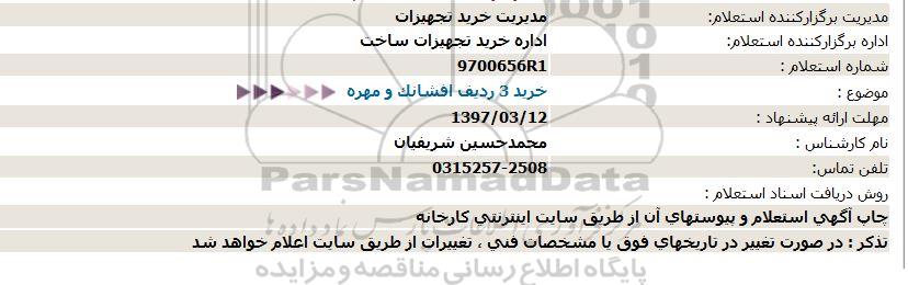 اداره برگزار کننده استعلام: اداره خرید تجهیزات ساخت