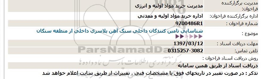 علاقهمندان میتوانند جهت دریافت اسناد و اطلاعات تکمیلی، فراخوان سنگ آهن پلاسری با سامانه مناقصات و مزایدات ایران پارسنماد داده ها 88349670 تماس حاصل نمایند.