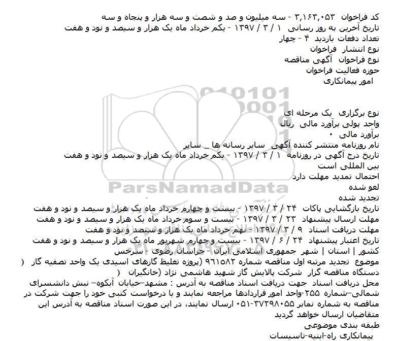 موضوع تجدید مرتبه اول مناقصه شماره ٩٦١٥٨٢ (پروژه تغلیظ گازهای اسیدی یک واحد تصفیه گاز)