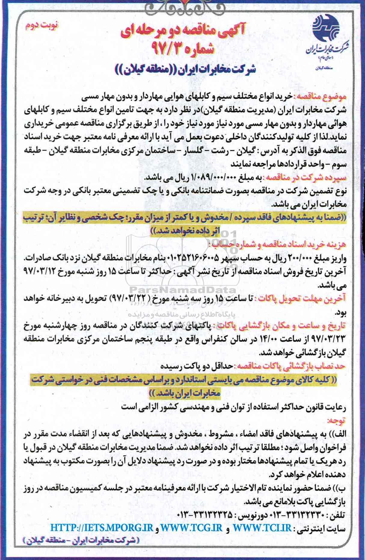 شرکت مخابرات ایران (مدیریت منطقه گیلان) در نظر دارد به جهت تامین انواع مختلف سیم و کابلهای هوائی مهاردار و بدون مهار مسی مورد نیاز خود را، از طریق برگزاری مناقصه عمومی خریداری نماید. لذا از کلیه تولیدکنندگان داخلی دعوت بعمل می آید با ارائه معرفی نامه معتبر جهت خرید اسناد مناقصه فوق الذکر به آدرس: گیلان- رشت- گلسار- ساختمان مرکزی مخابرات منطقه گیلان- طبقه سوم- واحد قراردادها مراجعه نمایند.