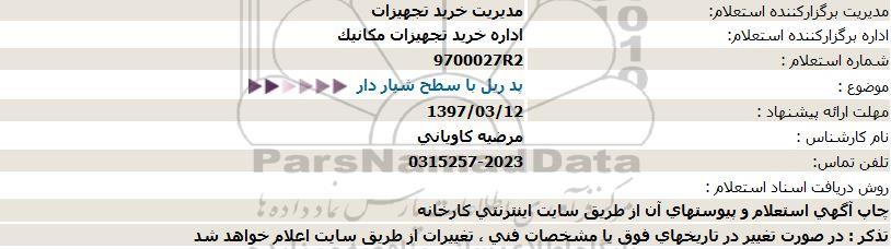 استعلام بها و موضوع استعلام استعلام ، استعلام پد ریل با سطح شیار دار به اطلاع کلیه شرکتها و افراد متخصص واجد شرایط میرساند، آگهی گذار در نظر دارد از طریق استعلام بها، نسبت به انتخاب و دریافت پیشنهادات اقدام نماید. این استعلام با کد آگهی ثبت شده در سامانه خبرگزاری پارس نماد : 1149998 منتشر شده است. مشخصات استعلام : تاریخ شروع استعلام: 1397/03/03 آخرین مهلت ارسال پیشنهاد قیمت : 1397/03/12 و محل اجرای پروژه : استان اصفهان میباشد. استعلام قیمت مورد درخواست : استعلام ، استعلام پد ریل با سطح شیار دار با دستهبندیهای تخصصی و گروه های مرتبط : تجهیزات و ماشین آلات صنعتی, استعلام اطلاع رسانی میگردد.