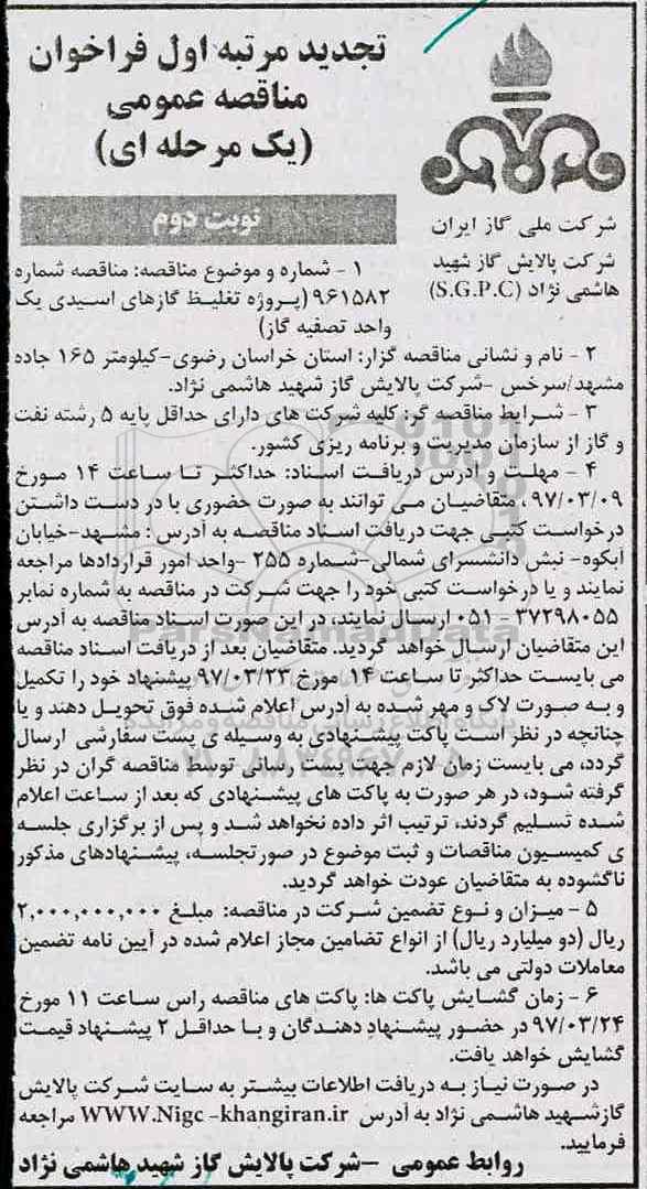 1- شماره و موضوع مناقصه: مناقصه شماره 961582 پروژه تغلیظ گازهای اسیدی یک واحد تصفیه گاز