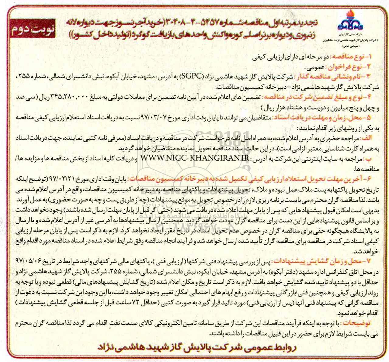 7- محل و زمان گشایش پیشنهادات: پس از بررسی پیشنهاد فنی شرکت ها ارزیابی فنی پاکتهای مالی شرکت های واجد شرایط در تاریخ 97.5.6 در محل اتاق کنفرانس اداره مشهد دفتر آبکوه به آدرس مشهد خیابان آبکوه نبش دانشسرای شمالی شماره 255 شرکت پالایش گاز شهید هاشمی نژاد و حداقل با دو پیشنهاد تایید شده گشایش خواهد یافت لازم به ذکر است تا تاریخ و مکان اعلام شده تاریخ گشایش پیشنهادهای مالی قطعی نبوده و با توجه به روند ارزیابی فنی پیشنهادات و رفع ابهام های احتمالی امکان تغییر وجود خواهد داشت با این وجود این شرکت نسبت به دعوت از مناقصه گرانی که پیشنهاد فنی آنها پس از ارزیابی فنی مورد تایید قرار گیرد به صورت کتبی حداقل 72 ساعت قبل از جلسه قطعی گشایش پیشنهادات اقدام خواهد نمود