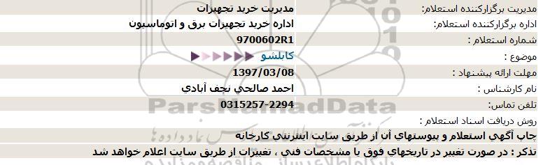استعلام بها و موضوع استعلام استعلام, استعلام کابلشو به اطلاع کلیه شرکتها و افراد متخصص واجد شرایط میرساند، آگهی گذار در نظر دارد از طریق استعلام بها، نسبت به انتخاب و دریافت پیشنهادات اقدام نماید. این استعلام با کد آگهی ثبت شده در سامانه خبرگزاری پارس نماد : 1153615 منتشر شده است. مشخصات استعلام : تاریخ شروع استعلام: 1397/03/06 آخرین مهلت ارسال پیشنهاد قیمت : 1397/03/08 و محل اجرای پروژه : استان اصفهان میباشد. استعلام قیمت مورد درخواست : استعلام, استعلام کابلشو با دستهبندیهای تخصصی و گروه های مرتبط : سیم و کابل, تجهیزات برق و الکترونیک, استعلام اطلاع رسانی میگردد.
