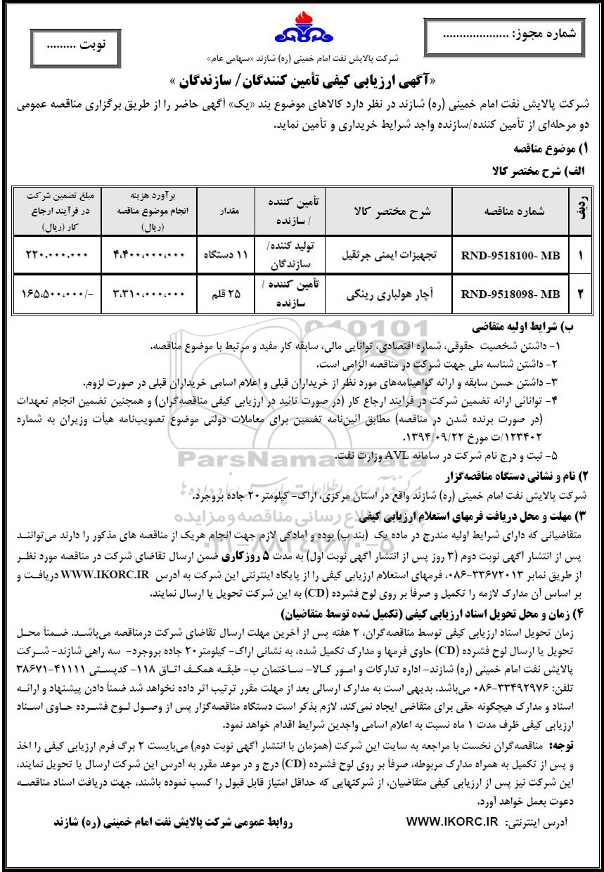 شرکت پالایش نفت امام خمینی (ره) شازند در نظر دارد کالاهای موضوع بند یک آگهی حاضر را از طریق برگزاری مناقصه عمومی دو مرحله ای از تامین کننده - سازنده واجد شرایط خریداری و تامین نماید