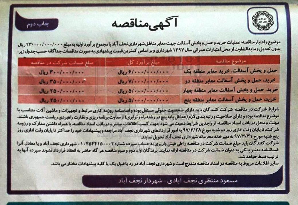 موضوع و اعتبار مناقصه عملیات خرید و حمل و پخش آسفالت جهت معابر مناطق شهرداری نجف آباد با مجموع برآورد اولیه به مبلع 23.000.000.000 ریال بدون تعدیل و ما به التفاوت از محل اعتبارات عمرانی سال 1397 شهرداری و براساس کمترین قیمت پیشنهادی به صورت مناقصات جداگانه حسب جدول زیر