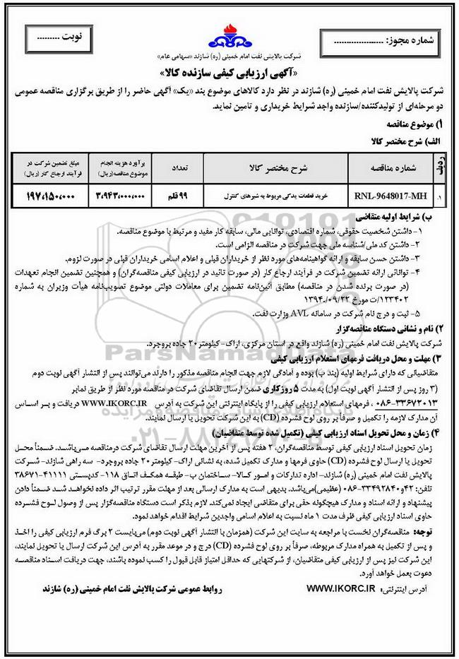 مناقصه خرید قطعات یدکی مربوط به شیرهای کنترل از کلیه افراد متخصص و شرکتها واجد شرایط دعوت به عمل میآید در مناقصه با کد خبرگزاری پارس نماد: 1160527 شرکت نمایند.