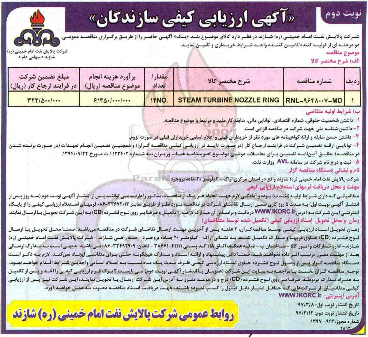 آگهی ارزیابی کیفی steam turbine nozzle ring از کلیه افراد متخصص و شرکتها واجد شرایط دعوت به عمل میآید در مناقصه با کد خبرگزاری پارس نماد: 1161652 شرکت نمایند.