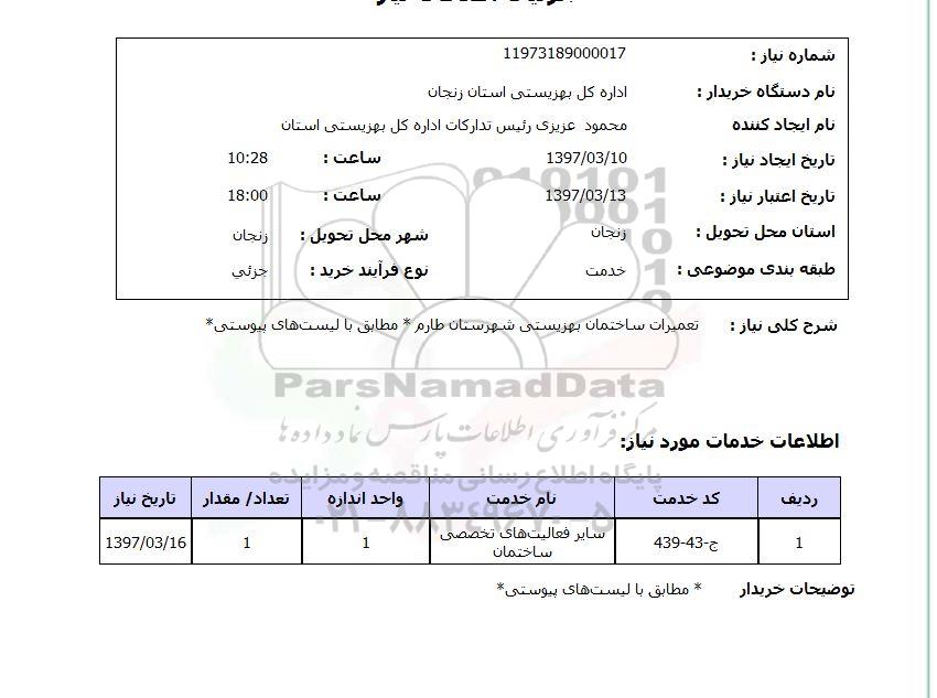 شرح کلی نیاز: تعمیرات ساختمان بهزیستی شهرستان طارم. مطابق با لیست های پیوستی