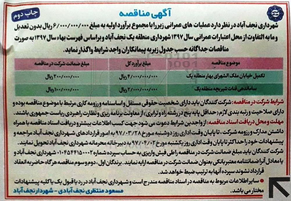 شهرداری نجف آباد در نظر دارد عملیات های عمرانی زیر را با مجموع برآورد اولیه به مبلغ 6.000.000.000 ریال بدون تعدیل و ما به التفاوت از محل اعتبارات عمرانی سال 97 شهرداری منطقه یک نجف آباد و براساس بهرست بهاء سال 1397 به صورت مناقصات جداگانه حسب جدول زیر به پیمانکاران واجد شرایط واگذار نماید.