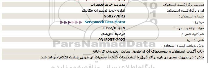 استعلام بها و موضوع استعلام استعلام,استعلام Servomech Gear Motor به اطلاع کلیه شرکتها و افراد متخصص واجد شرایط میرساند، آگهی گذار در نظر دارد از طریق استعلام بها، نسبت به انتخاب و دریافت پیشنهادات اقدام نماید. این استعلام با کد آگهی ثبت شده در سامانه خبرگزاری پارس نماد : 1162287 منتشر شده است. مشخصات استعلام : تاریخ شروع استعلام: 1397/03/12 آخرین مهلت ارسال پیشنهاد قیمت : 1397/03/19 و محل اجرای پروژه : استان اصفهان میباشد. استعلام قیمت مورد درخواست : استعلام,استعلام Servomech Gear Motor با دستهبندیهای تخصصی و گروه های مرتبط : تجهیزات و ماشین آلات صنعتی, استعلام اطلاع رسانی میگردد.