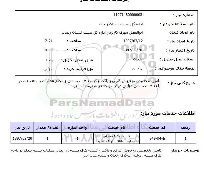 شرح کلی نیاز: تامین، تخصیص، و فروش کارتن و پاکت و کیسه های پستی و انجام عملیات بسته بندی در باجه های پستی دولتی مرکزی زنجان و شهرستان ابهر