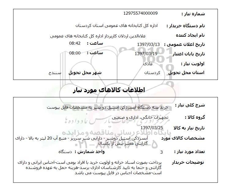 شرح کلی نیاز: خرید سه دستگاه آبسردکن استیل دو شیر به مشخصات فایل پیوست