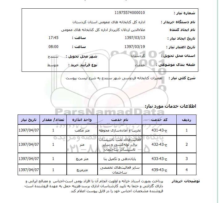 شرح کلی نیاز: تعمیرات کتابخانه فردوسی شهر سنندج به شرح لیست پیوست