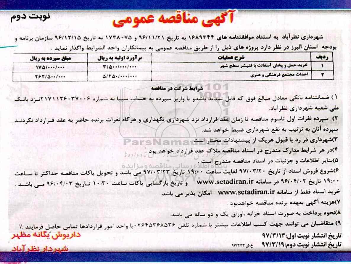 شهرداری نظرآباد در نظر دارد پروژه های ذیل را از طریق مناقصه عمومی به پیمانکاران واجد الشرایط واگذار نماید