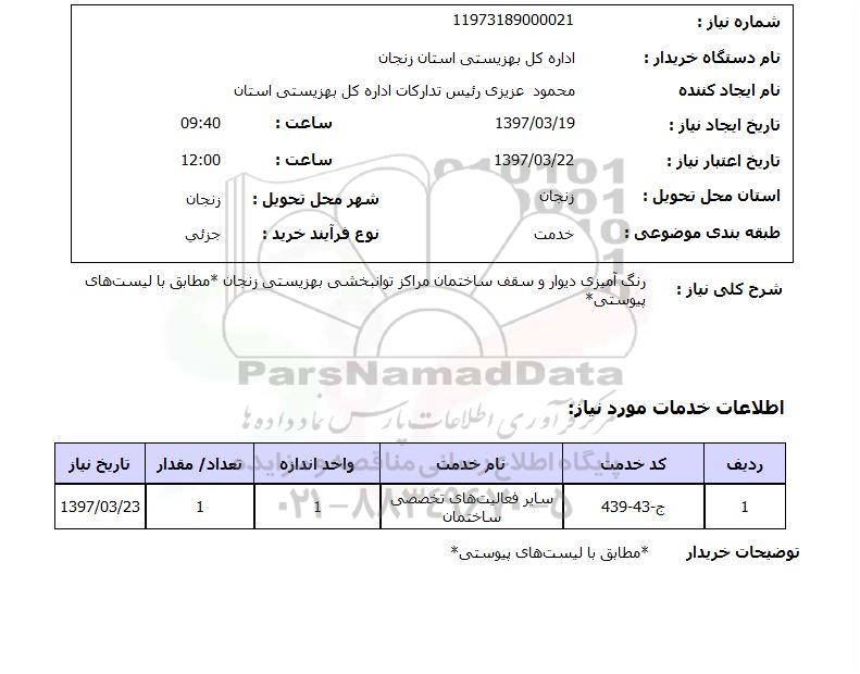 شرح کلی نیاز : رنگ آمیزی دیوار و سقف ساختمان مراکز توانبخشی بهزیستی زنجان * مطابق با لیست های پیوستی *