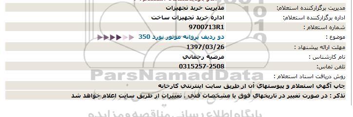 استعلام بها و موضوع استعلام استعلام , استعلام دو ردیف پروانه موتور نورد 350 به اطلاع کلیه شرکتها و افراد متخصص واجد شرایط میرساند، آگهی گذار در نظر دارد از طریق استعلام بها، نسبت به انتخاب و دریافت پیشنهادات اقدام نماید. این استعلام با کد آگهی ثبت شده در سامانه خبرگزاری پارس نماد : 1171311 منتشر شده است. مشخصات استعلام : تاریخ شروع استعلام: 1397/03/21 آخرین مهلت ارسال پیشنهاد قیمت : 1397/03/26 و محل اجرای پروژه : استان اصفهان میباشد. استعلام قیمت مورد درخواست : استعلام , استعلام دو ردیف پروانه موتور نورد 350 با دستهبندیهای تخصصی و گروه های مرتبط : تجهیزات و ماشین آلات صنعتی, استعلام اطلاع رسانی میگردد.