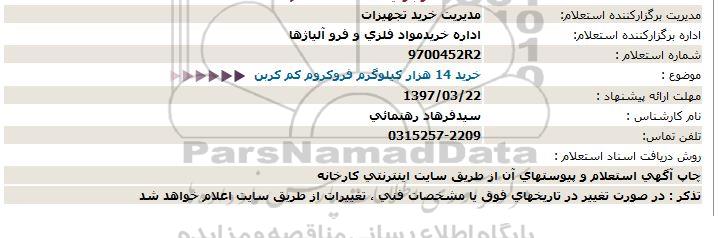 استعلام خرید 14 هزار کیلوگرم فروکروم و کم کربن, استعلام , استعلام خرید 14 هزار کیلوگرم فروکروم و کم کربن