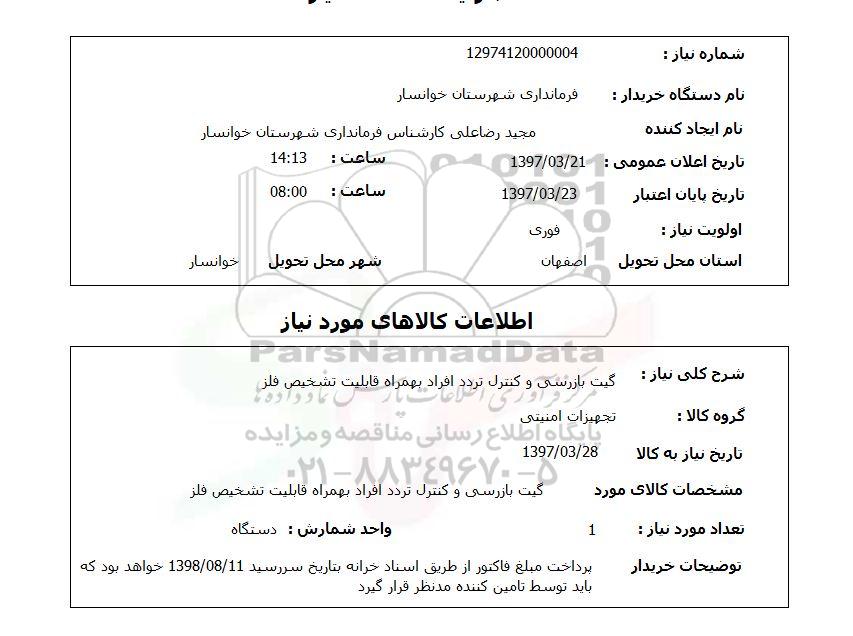 نام دستگاه خریدار: فرمانداری شهرستان خوانسار