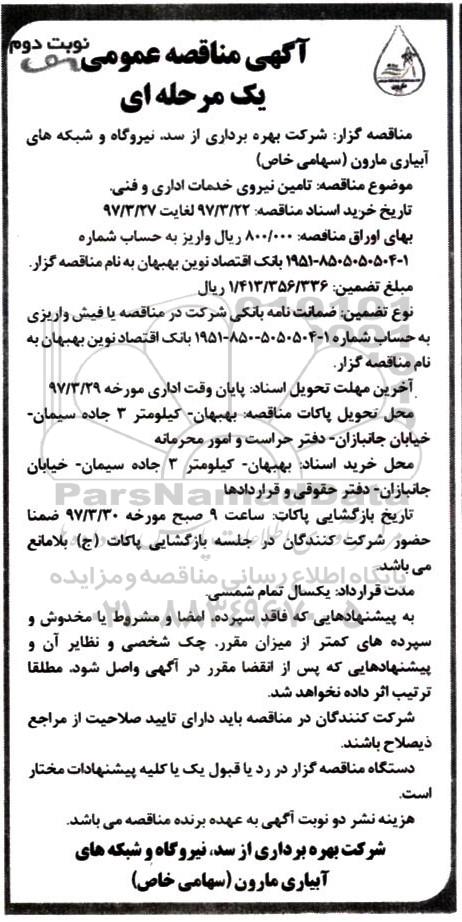 مناقصه تامین نیروی خدمات اداری و فنی (نوبت دوم) از کلیه افراد متخصص و شرکتها واجد شرایط دعوت به عمل میآید در مناقصه با کد خبرگزاری پارس نماد: 1172607 شرکت نمایند.