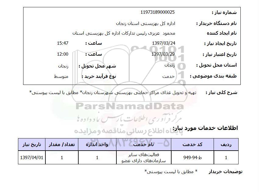 شرح کلی نیاز: تهیه و تحویل غذای مراکز حمایتی بهزیستی شهرستان زنجان (مطابق با لیست پیوستی)