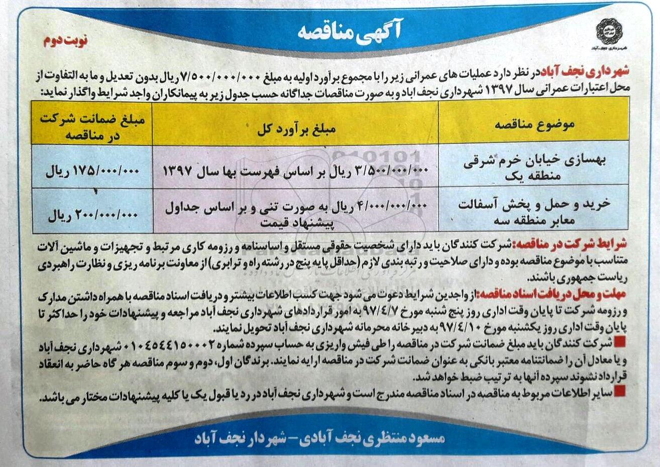 شهرداری نجف آباد در نظر دارد عملیات های عمرانی زیر را با مجموع برآورد اولیه به مبلغ 7.500.000.000 ریال بدون تعدیل و ما به التفاوت از محل اعتبارات عمرانی سال 97 شهرداری نجف آباد و به صورت مناقصات جداگانه حسب جدول زیر به پیمانکاران واجد شرایط واگذار نماید.