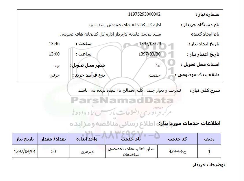 شرح کلی نیاز :     تخریب و دیوار چینی کلیه مصالح به عهده برنده می باشد