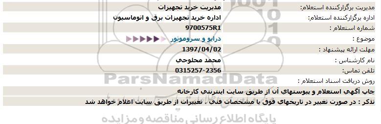 استعلام بها و موضوع استعلام استعلام ، استعلام درایو و سر و موتور به اطلاع کلیه شرکتها و افراد متخصص واجد شرایط میرساند، آگهی گذار در نظر دارد از طریق استعلام بها، نسبت به انتخاب و دریافت پیشنهادات اقدام نماید. این استعلام با کد آگهی ثبت شده در سامانه خبرگزاری پارس نماد : 1185704 منتشر شده است. مشخصات استعلام : تاریخ شروع استعلام: 1397/03/31 آخرین مهلت ارسال پیشنهاد قیمت : 1397/04/02 و محل اجرای پروژه : استان اصفهان میباشد. استعلام قیمت مورد درخواست : استعلام ، استعلام درایو و سر و موتور با دستهبندیهای تخصصی و گروه های مرتبط : اتوماسیون ، مراکز کنترل صنعتی, تجهیزات برق و الکترونیک, استعلام اطلاع رسانی میگردد.