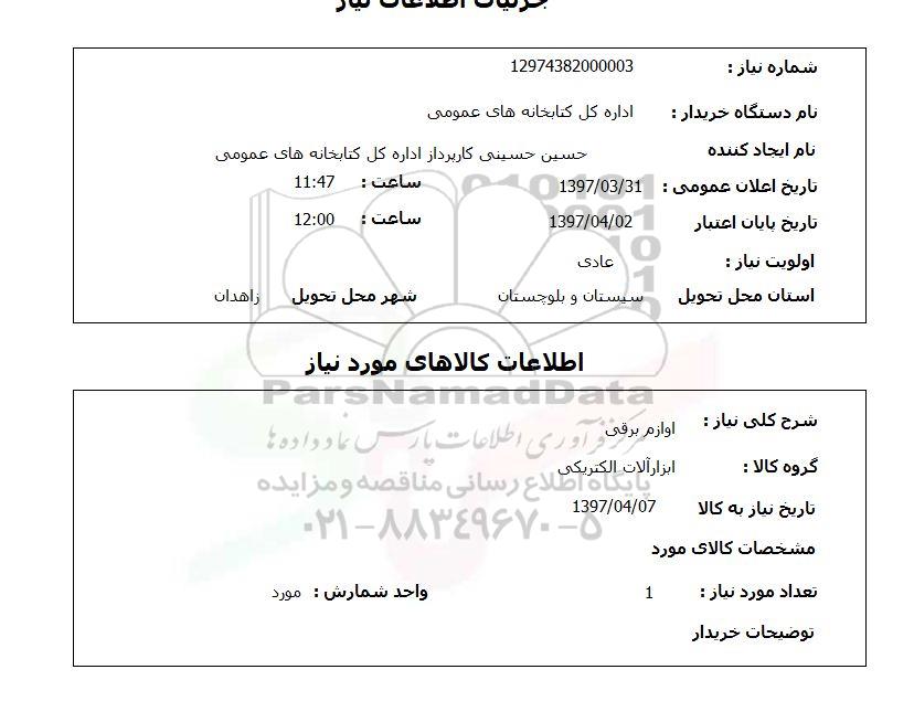 استعلام بها و موضوع استعلام استعلام, لوازم برقی به اطلاع کلیه شرکتها و افراد متخصص واجد شرایط میرساند، آگهی گذار در نظر دارد از طریق استعلام بها، نسبت به انتخاب و دریافت پیشنهادات اقدام نماید. این استعلام با کد آگهی ثبت شده در سامانه خبرگزاری پارس نماد : 1186397 منتشر شده است. مشخصات استعلام : تاریخ شروع استعلام: 1397/04/02 آخرین مهلت ارسال پیشنهاد قیمت : 1397/04/02 و محل اجرای پروژه : استان سیستان و بلوچستان میباشد. استعلام قیمت مورد درخواست : استعلام, لوازم برقی با دستهبندیهای تخصصی و گروه های مرتبط : تجهیزات برق و الکترونیک, استعلام اطلاع رسانی میگردد.