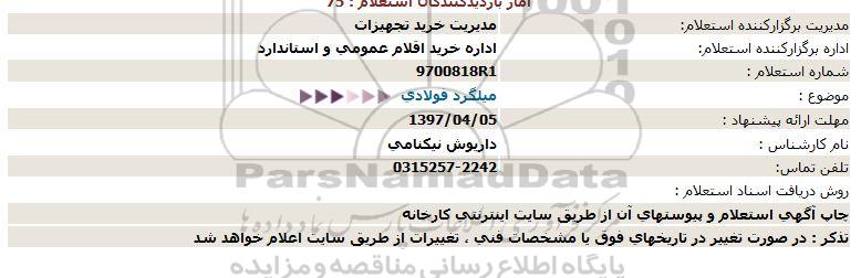 استعلام بها و موضوع استعلام استعلام, استعلام میلگرد فولادی به اطلاع کلیه شرکتها و افراد متخصص واجد شرایط میرساند، آگهی گذار در نظر دارد از طریق استعلام بها، نسبت به انتخاب و دریافت پیشنهادات اقدام نماید. این استعلام با کد آگهی ثبت شده در سامانه خبرگزاری پارس نماد : 1187062 منتشر شده است. مشخصات استعلام : تاریخ شروع استعلام: 1397/04/02 آخرین مهلت ارسال پیشنهاد قیمت : 1397/04/05 و محل اجرای پروژه : استان اصفهان میباشد. استعلام قیمت مورد درخواست : استعلام, استعلام میلگرد فولادی با دستهبندیهای تخصصی و گروه های مرتبط : آهن آلات, استعلام اطلاع رسانی میگردد.