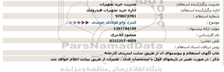 اداره برگزارکننده استعلام: اداره خرید تجهیزات هیدرولیک