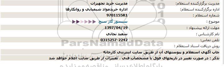 استعلام بها و موضوع استعلام استعلام, استعلام سنسور گاز سنج به اطلاع کلیه شرکتها و افراد متخصص واجد شرایط میرساند، آگهی گذار در نظر دارد از طریق استعلام بها، نسبت به انتخاب و دریافت پیشنهادات اقدام نماید. این استعلام با کد آگهی ثبت شده در سامانه خبرگزاری پارس نماد : 1207696 منتشر شده است. مشخصات استعلام : تاریخ شروع استعلام: 1397/04/13 آخرین مهلت ارسال پیشنهاد قیمت : 1397/04/19 و محل اجرای پروژه : استان اصفهان میباشد. استعلام قیمت مورد درخواست : استعلام, استعلام سنسور گاز سنج با دستهبندیهای تخصصی و گروه های مرتبط : ابزار دقیق, سیستم ایمنی ، اتش نشانی،اعلام و اطفای حریق, استعلام اطلاع رسانی میگردد.