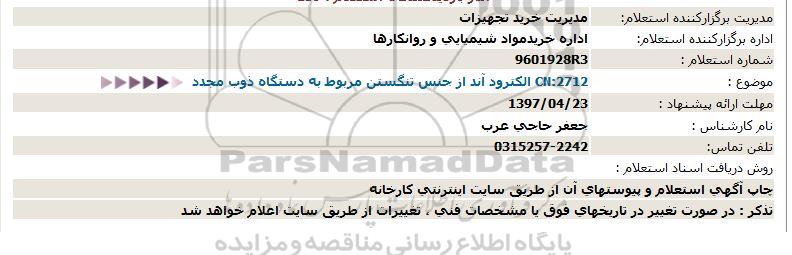 استعلام خرید الکترود آند از جنس تنگستن از کلیه افراد متخصص و شرکتها واجد شرایط دعوت به عمل میآید در مناقصه با کد خبرگزاری پارس نماد: 1209022 شرکت نمایند.