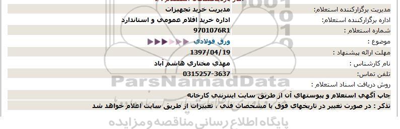 استعلام بها و موضوع استعلام استعلام,استعلام ورق فولادی به اطلاع کلیه شرکتها و افراد متخصص واجد شرایط میرساند، آگهی گذار در نظر دارد از طریق استعلام بها، نسبت به انتخاب و دریافت پیشنهادات اقدام نماید. این استعلام با کد آگهی ثبت شده در سامانه خبرگزاری پارس نماد : 1209037 منتشر شده است. مشخصات استعلام : تاریخ شروع استعلام: 1397/04/14 آخرین مهلت ارسال پیشنهاد قیمت : 1397/04/19 و محل اجرای پروژه : استان اصفهان میباشد. استعلام قیمت مورد درخواست : استعلام,استعلام ورق فولادی با دستهبندیهای تخصصی و گروه های مرتبط : آهن آلات, انواع ورق, استعلام اطلاع رسانی میگردد.