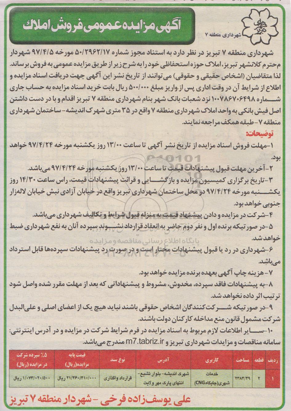 مزایده فروش املاک کاربری خدمات شهری جایگاه سی ان جی
