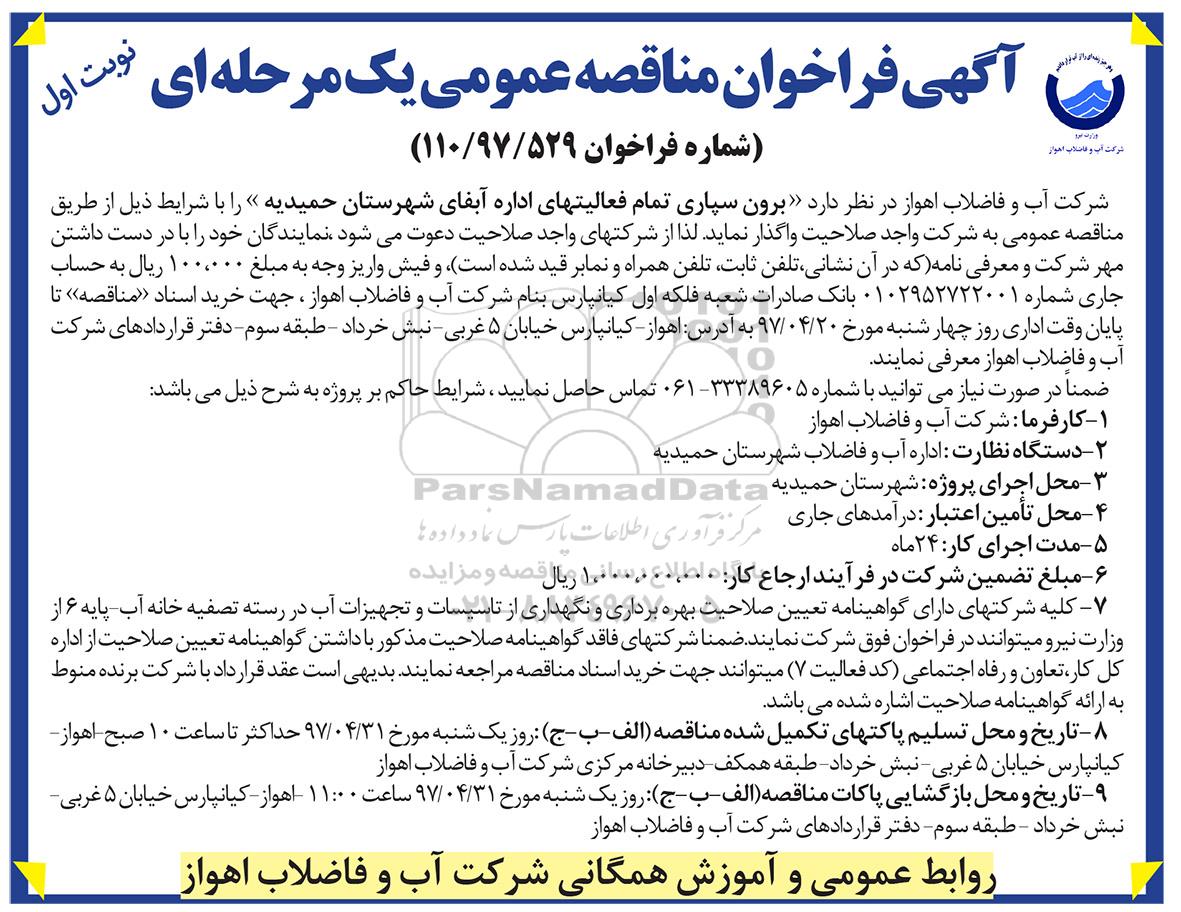 شرکت آب و فاضلاب اهواز در نظر دارد برون سپاری تمام فعالیتهای اداره آبفا شهرستان حمیدیه را با شرایط ذیل از طریق مناقصه عمومی به شرکت واجد صلاحیت واگذار نماید. لذا از شرکت های واجد صلاحیت دعوت می شود نمایندگان خوئد را با در دست داشتن مهر شرکت و معرفی نامه (که در آن نشانی، تلفن ثابت، تلفن همراه و نمابر قید شده است)، اصل و تصویر گواهینامه صلاحیت پیمانکاری و فیش واریز به مبلغ 100.000 ریال به حساب جاری شماره 0102952722001 بانک صادرات شعبه فلکه اول کیانپارس بنام شرکت آب و فاضلاب اهواز جهت خرید اسناد مناقصه تا پایان وقت اداری روز 4شنبه مورخ 97.4.20 به یکی از آدرس های ذیل: