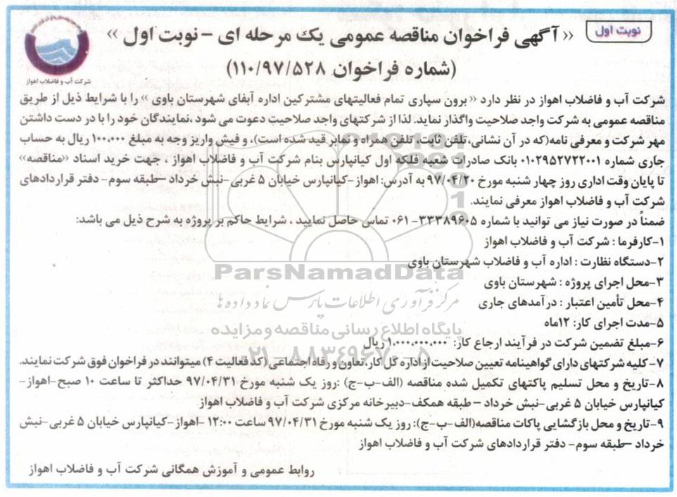 شرکت آب و فاضلاب اهواز در نظر دارد برون سپاری تمام فعالیتهای مشترکین اداره آبفا شهرستان باوی را با شرایط ذیل از طریق مناقصه عمومی به شرکت واجد صلاحیت واگذار نماید. لذا از شرکت های واجد صلاحیت دعوت می شود نمایندگان خوئد را با در دست داشتن مهر شرکت و معرفی نامه (که در آن نشانی، تلفن ثابت، تلفن همراه و نمابر قید شده است)، اصل و تصویر گواهینامه صلاحیت پیمانکاری و فیش واریز به مبلغ 100.000 ریال به حساب جاری شماره 0102952722001 بانک صادرات شعبه فلکه اول کیانپارس بنام شرکت آب و فاضلاب اهواز جهت خرید اسناد مناقصه تا پایان وقت اداری روز 4شنبه مورخ 97.4.20 به یکی از آدرس های ذیل: