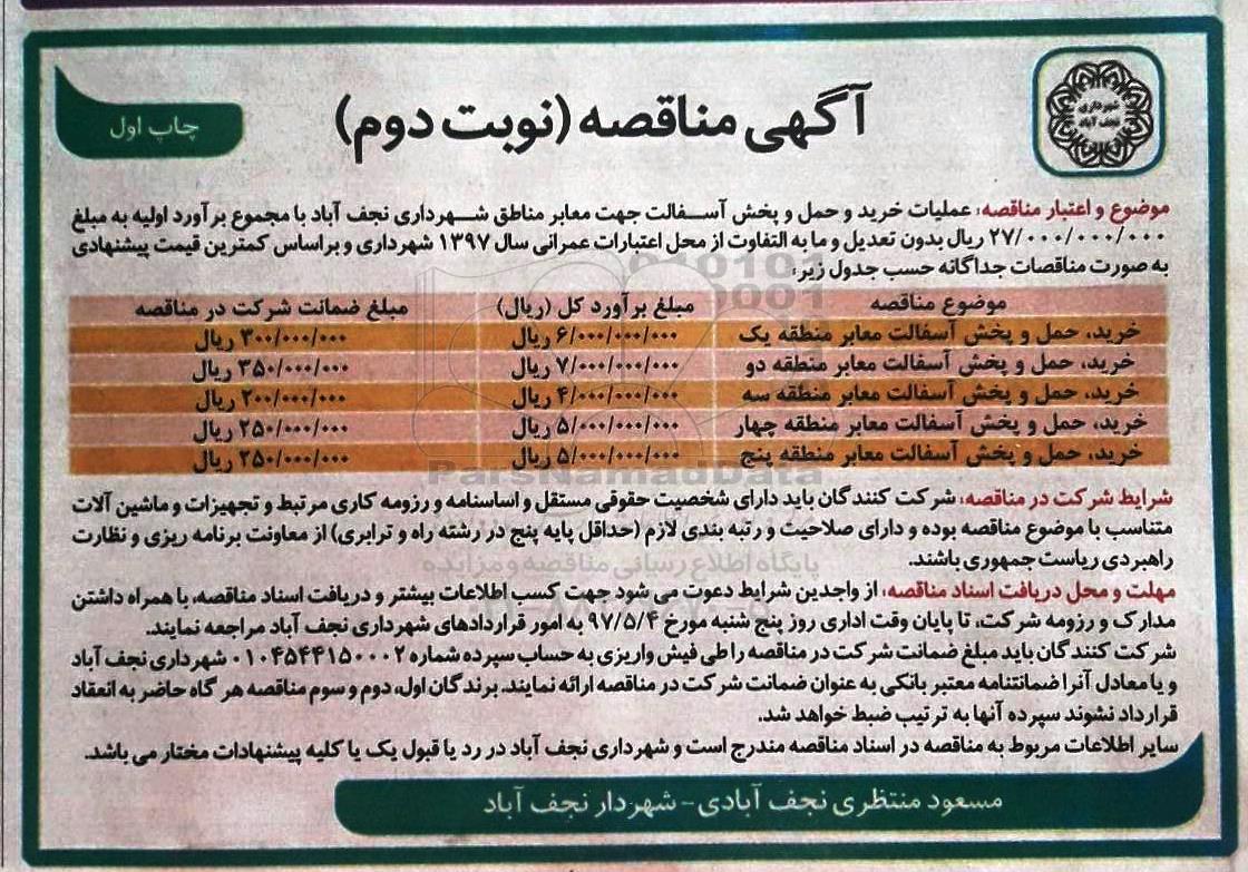شهرداری نجف آباد در نظر دارد نسبت به اجرای عملیات خرید ، حمل و پخش آسفالت جهت معابر مناطق شهرداری نجف آباد با  برآورد اولیه به مبلغ 27.000.000.000 ریال بدون تعدیل و مابه التفاوت از محل اعتبارات عمرانی سال 97 شهرداری و براساس کمترین قیمت پیشنهادی به صورت مناقصات جداگانه حسب جدول زیر: