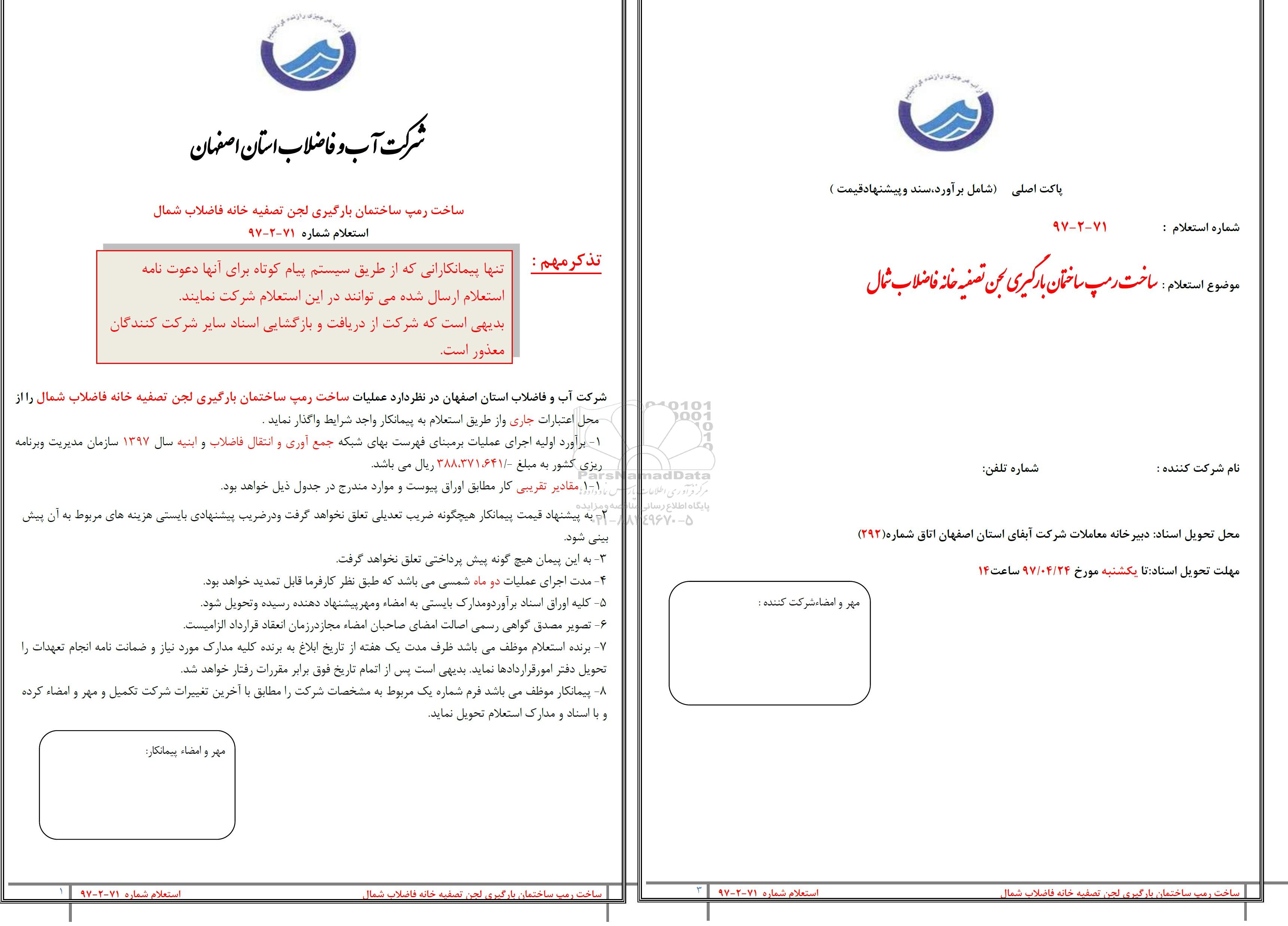 محل تحویل اسناد : دبیرخانه معاملات شرکت آبفای استان اصفهان اتاق شماره 292