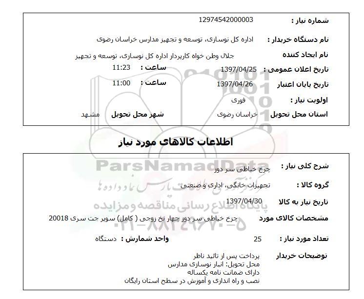 نام دستگاه خریدار :     اداره کل نوسازی، توسعه و تجهیز مدارس خراسان رضوی